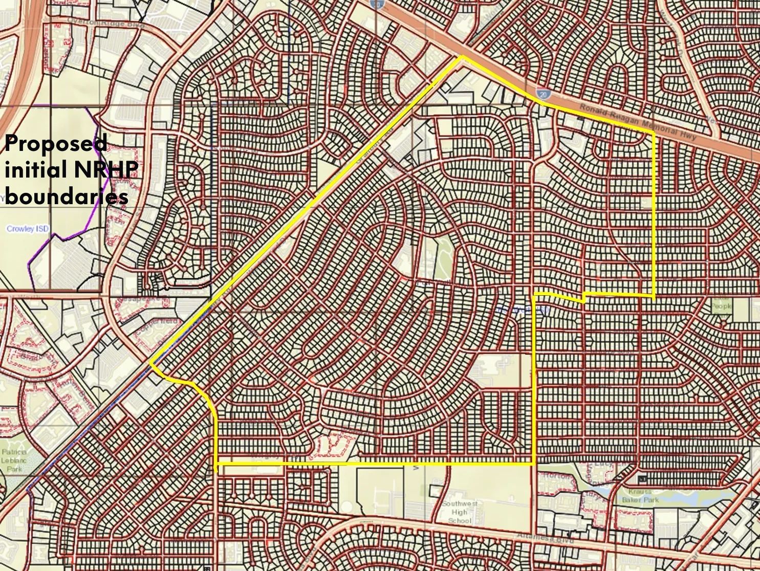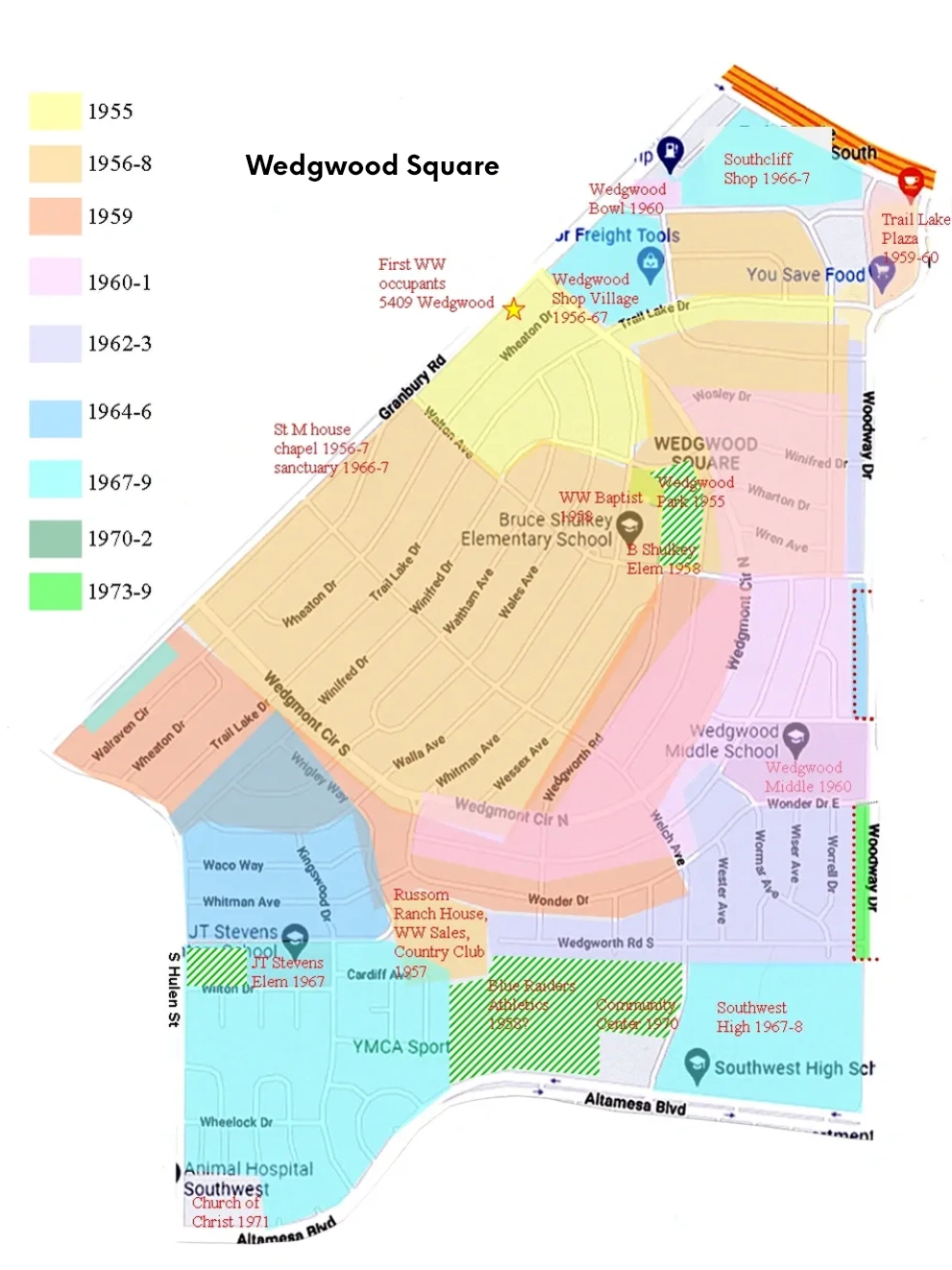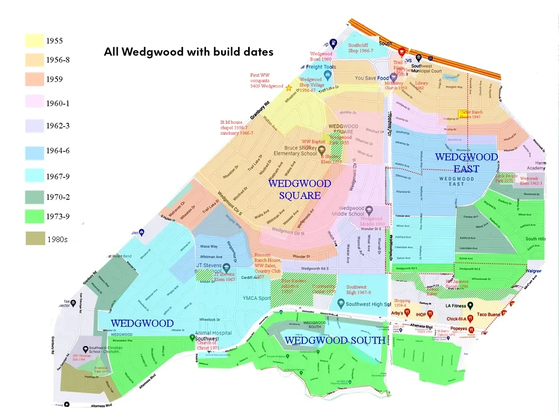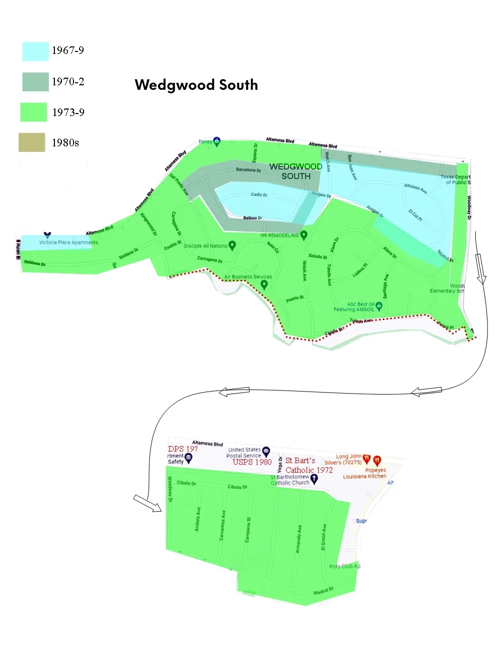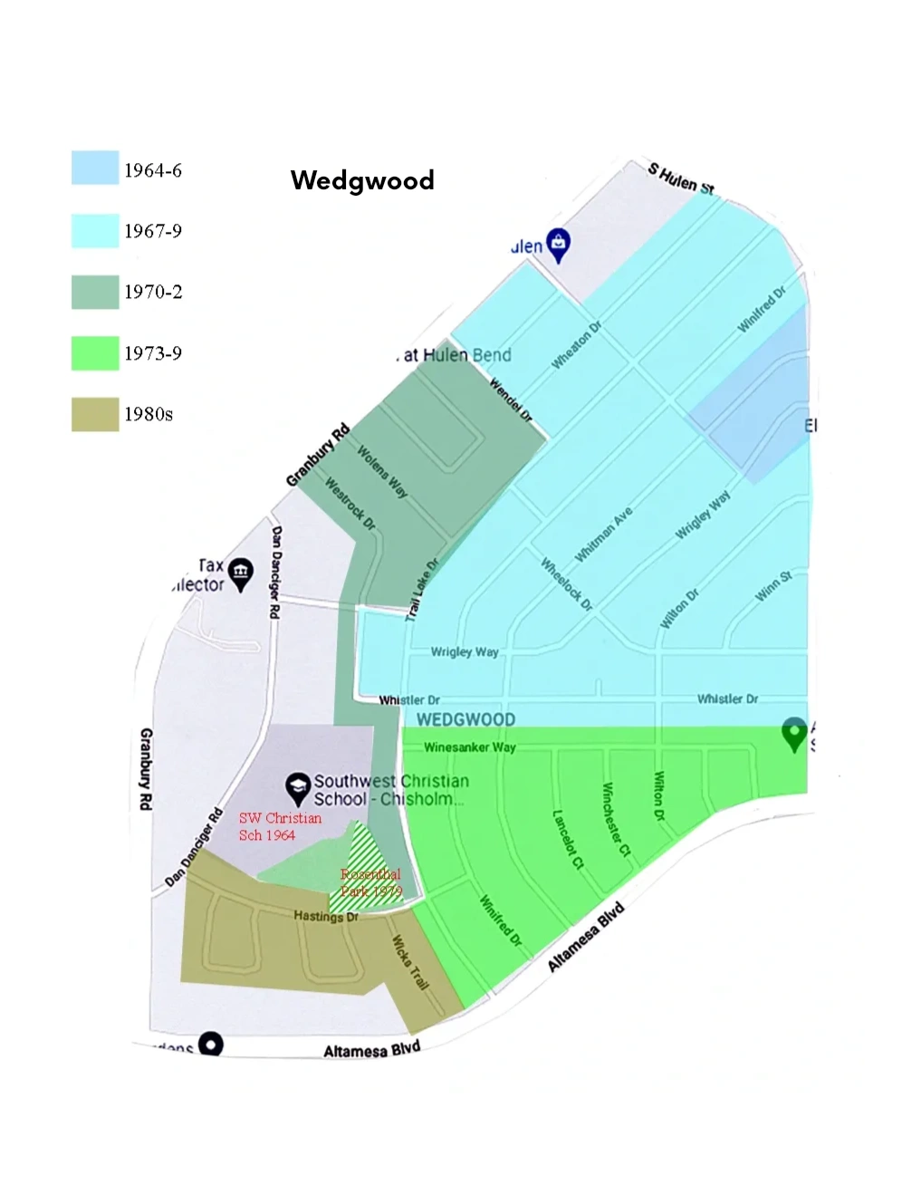 See map below. The boundaries closely reflect those of a 1955 plat map and take into consideration what was actually built versus the plan. For this initial nomination, we have not included homes: in Wedgwood Square south of Wedgworth Road South, in Wedgwood East that list South Hills on their deeds, in the area west of Hulen Street, or in Wedgwood South. These areas can be added to the district at a later date or become separate historic districts.